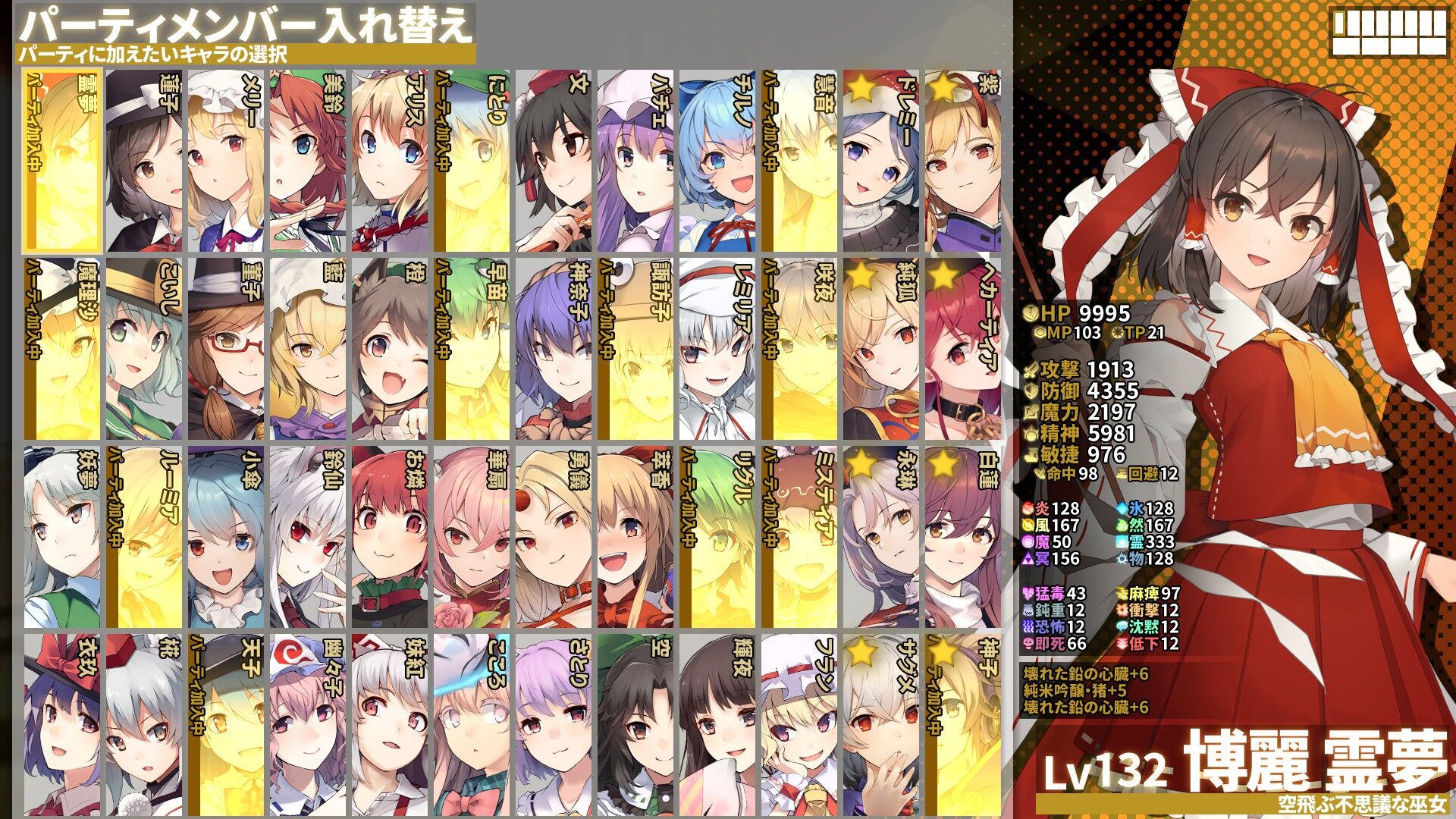 その他はドングリの背比べ。後半になればアイテムや金でいくらでもドーピングできるのでどうにでもなります。ただ妖夢や藍、お燐みたいな相手フィールドに干渉して準備が必要なキャラは愛がないと厳しいかもしれない(味方の攻撃で準備が吹き飛んでしまうため)